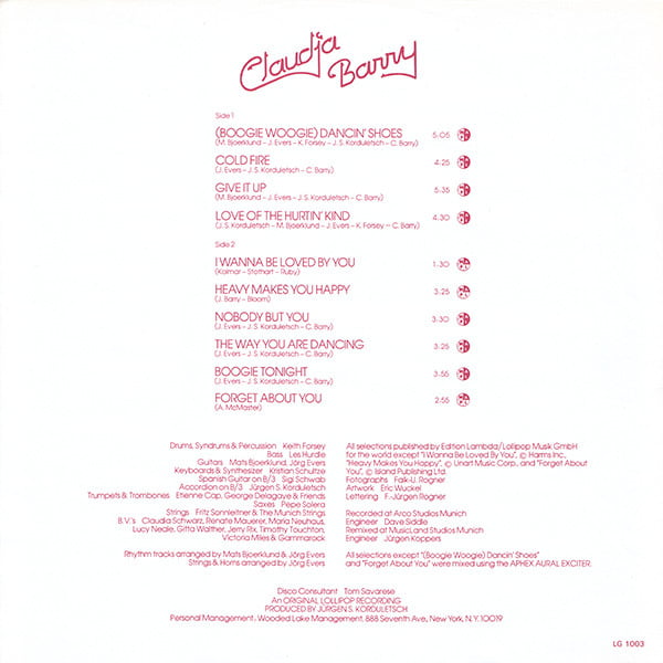 A1: (Boogie Woogie) Dancin' Shoes A2: Cold Fire A3: Give It Up A4: Love Of The Hurtin' Kind B1: I Wanna Be Loved By You B2: Heavy Makes You Happy B3: Nobody But You B4: The Way You Are Dancing B5: Boogie Tonight B6: Forget About You