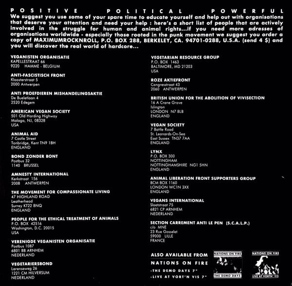 Original first pressing of this seminal hardcore punk rock ’91 German band. They were political, straight-edge, and their lyrics expressed their political consciousness and rage against the system. Nations On Fire is mandatory curriculum!